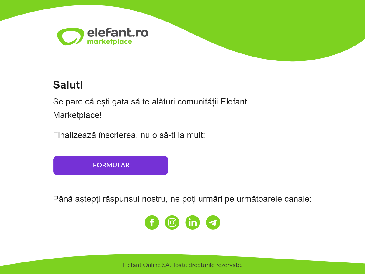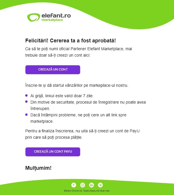 • După înregistrare, aplicația ta va fi procesată de către echipa elefant marketplace și vei primi un email de validare.