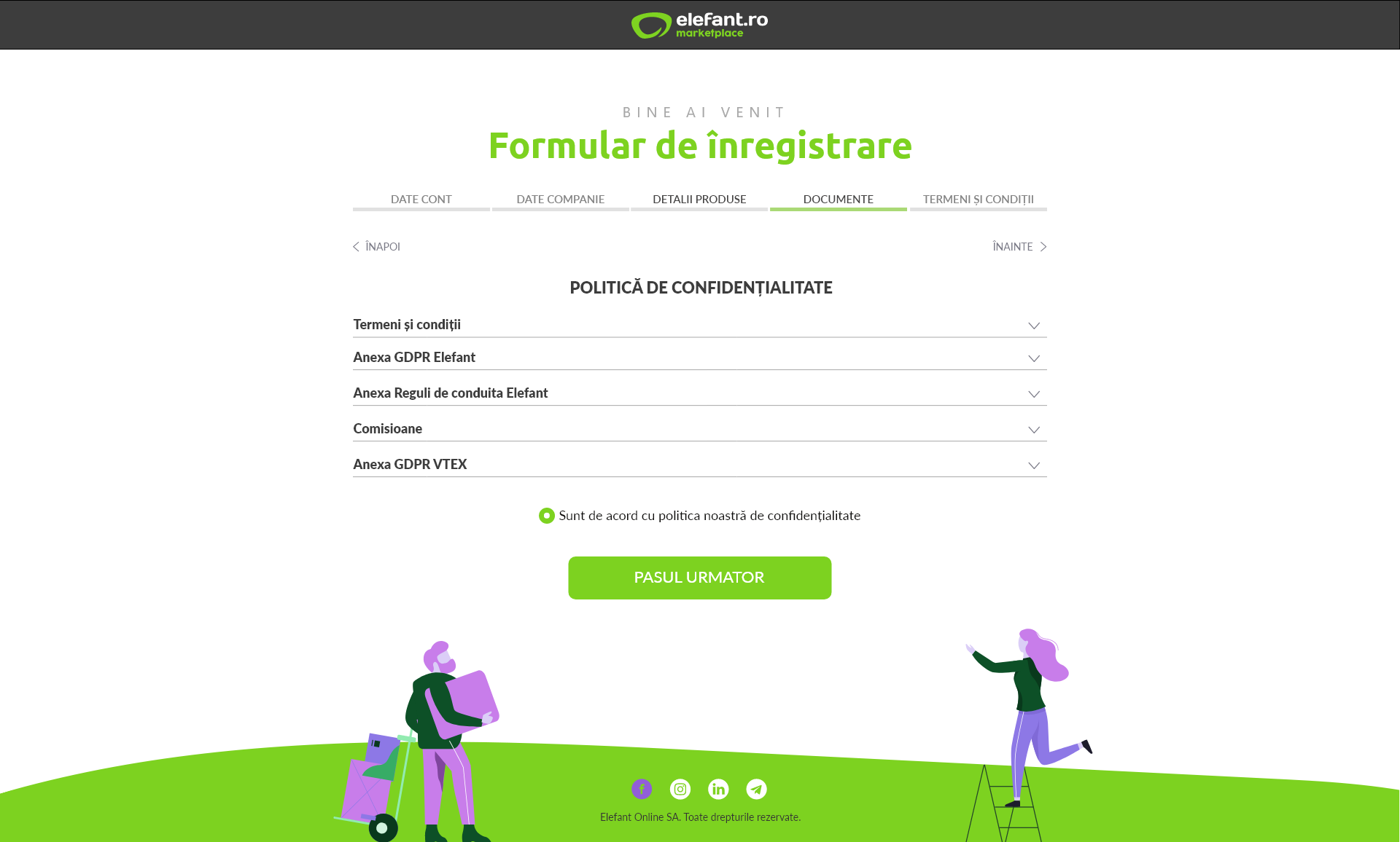 • Accesează linkul și completează toate etapele din formularul de înregistrare. Încarcă documentele și bifează că ești de acord cu termenii și condițiile de înregistrare pe platforma elefant marketplace.