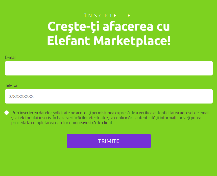 • Accesează butonul: Devino partener din pagina marketplace.elefant.ro.