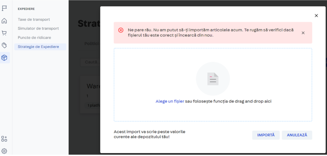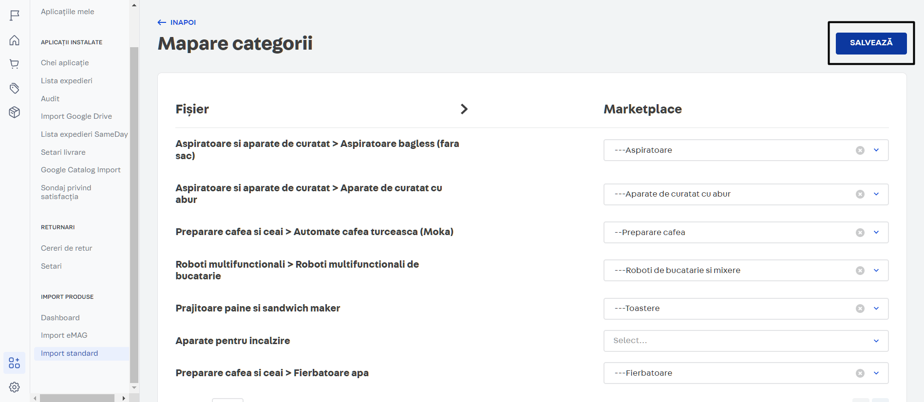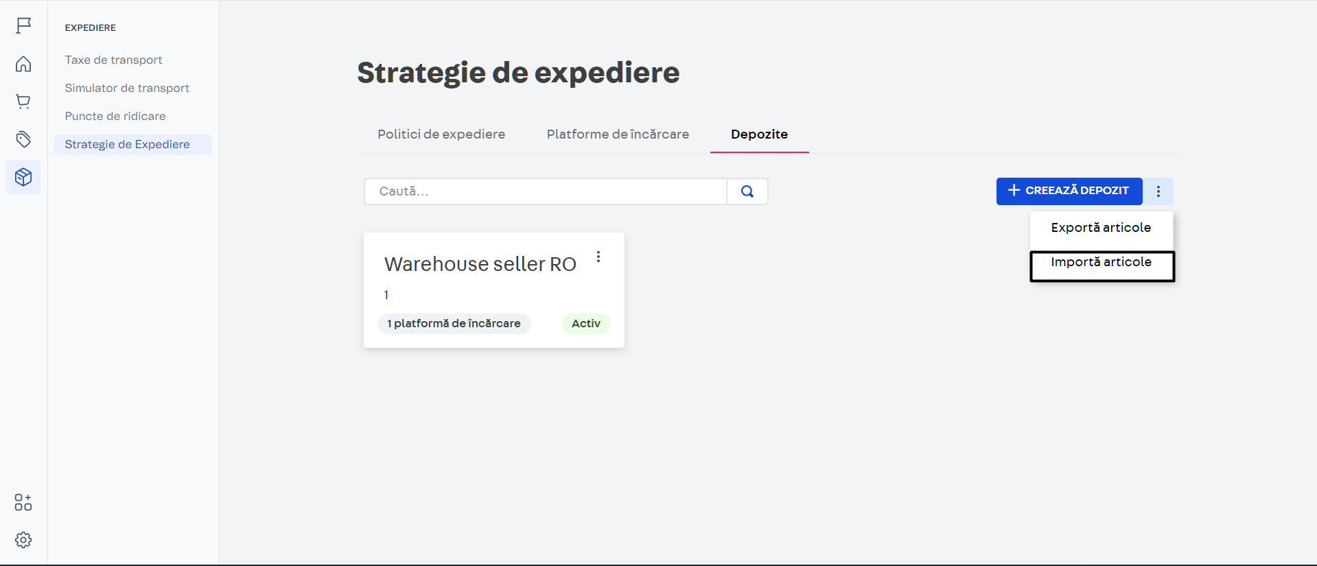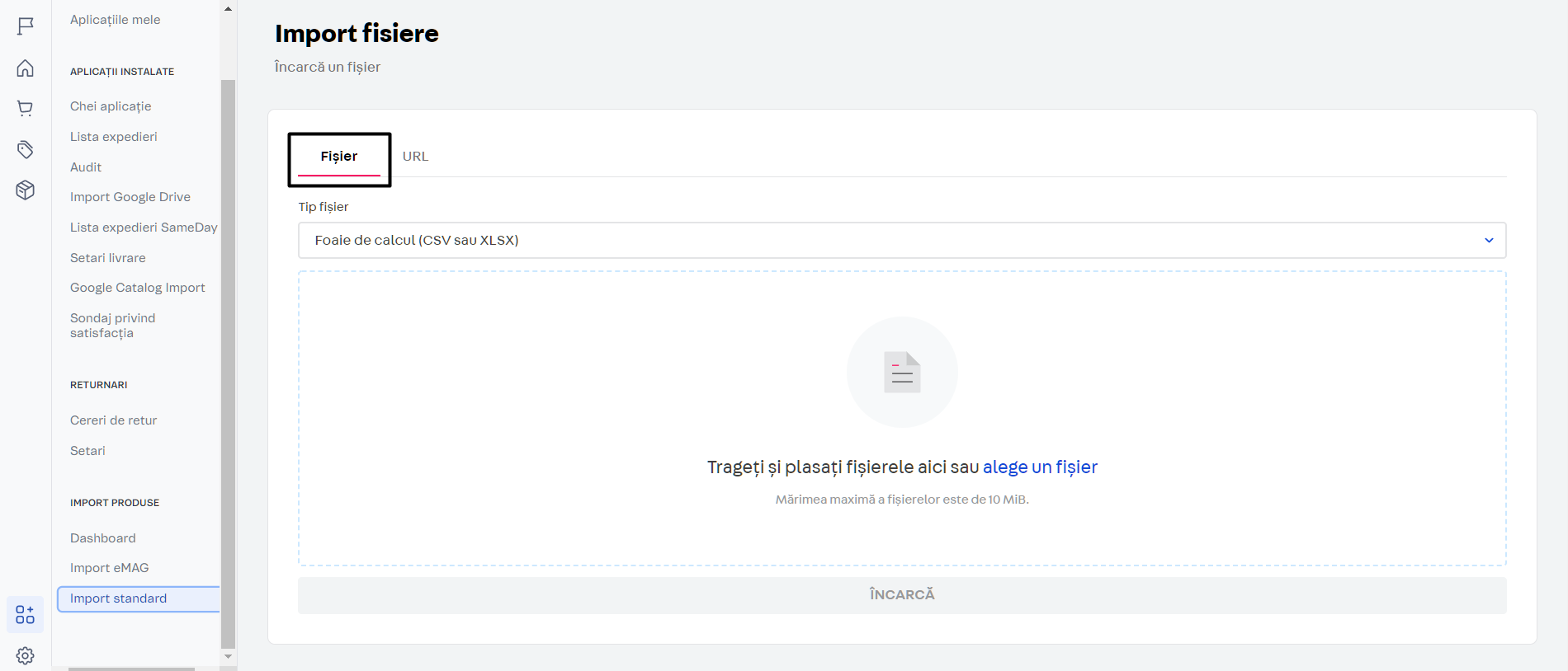 • Import - importarea produselor se poate efectua din contul de seller prin încărcarea unui fișier excel, csv, xml sau inserarea unui link cu feed. Astfel, vei putea propune spre publicare, automat, cât mai multe produse.