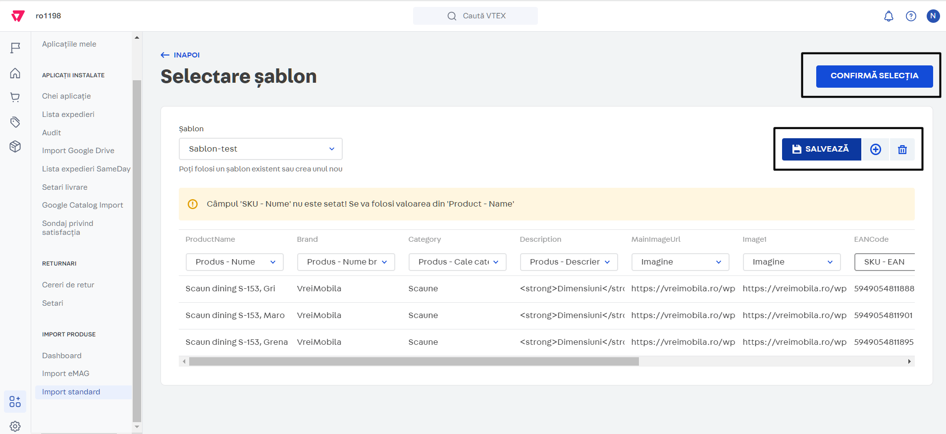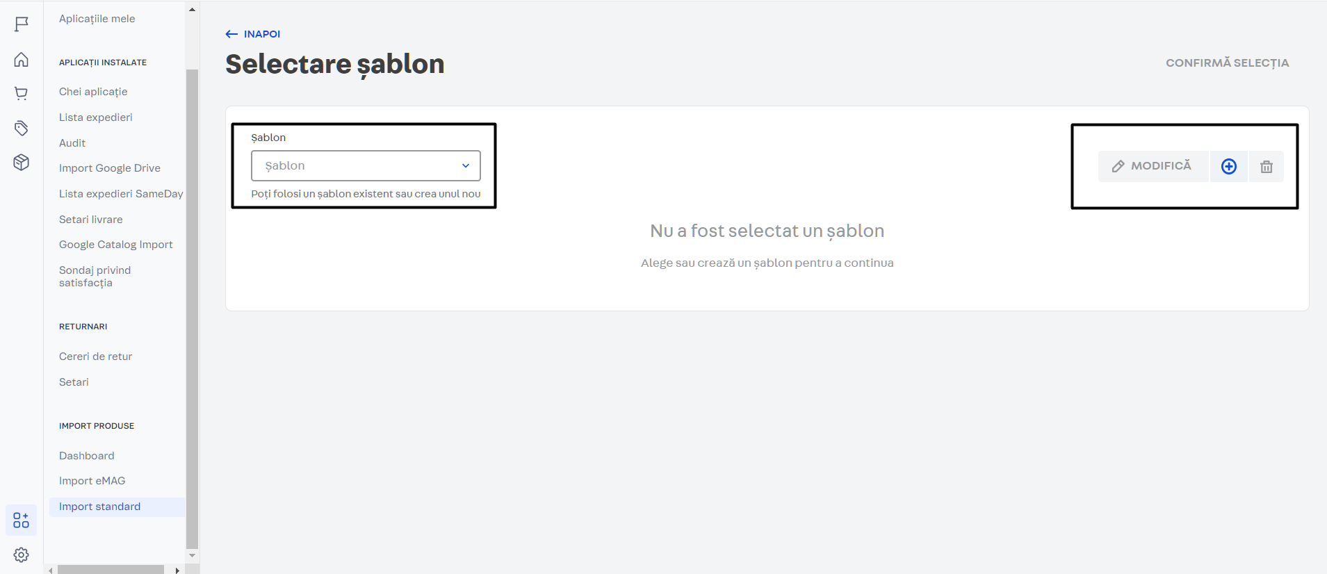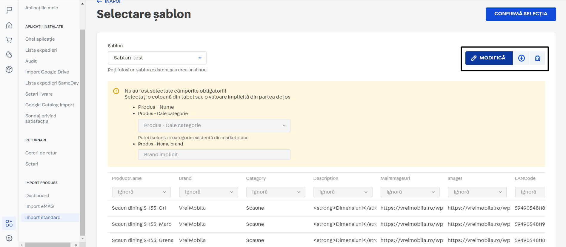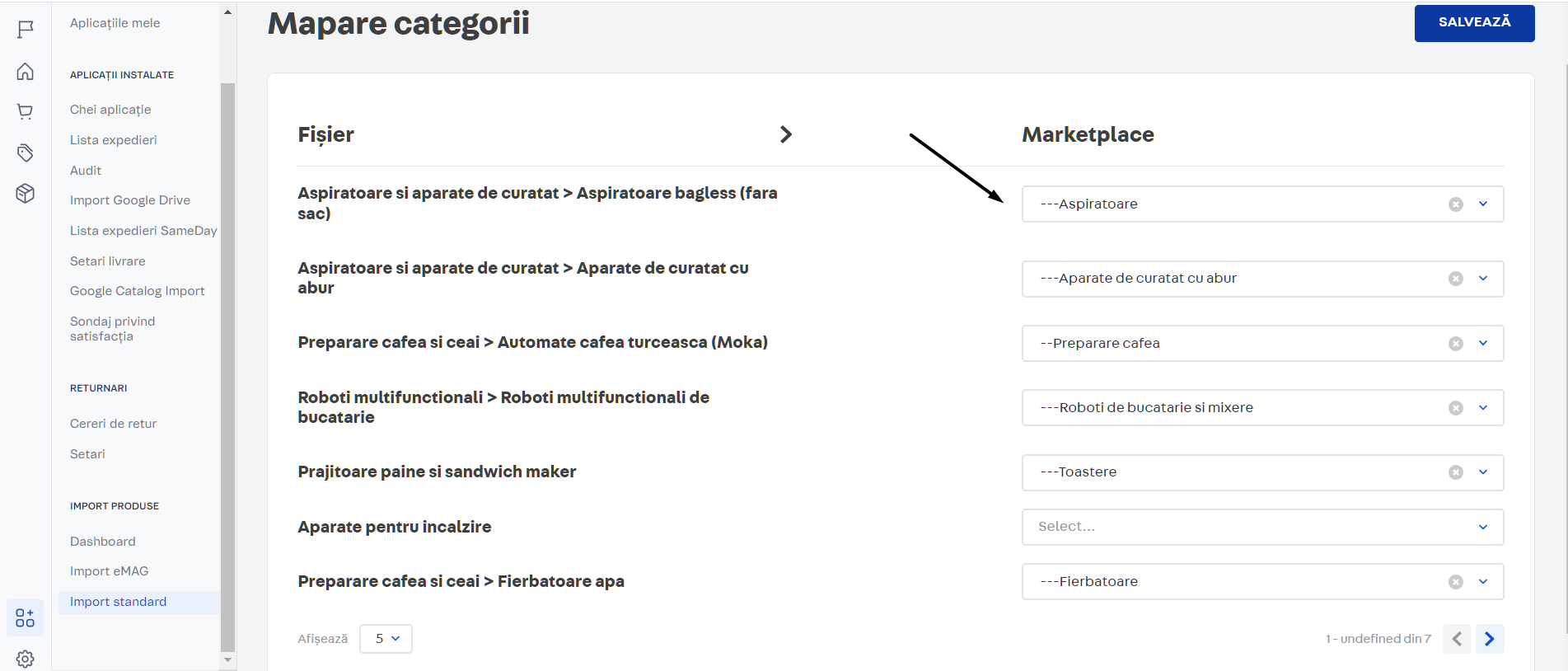 • Import - importarea produselor se poate efectua din contul de seller prin încărcarea unui fișier excel, csv, xml sau inserarea unui link cu feed. Astfel, vei putea propune spre publicare, automat, cât mai multe produse.